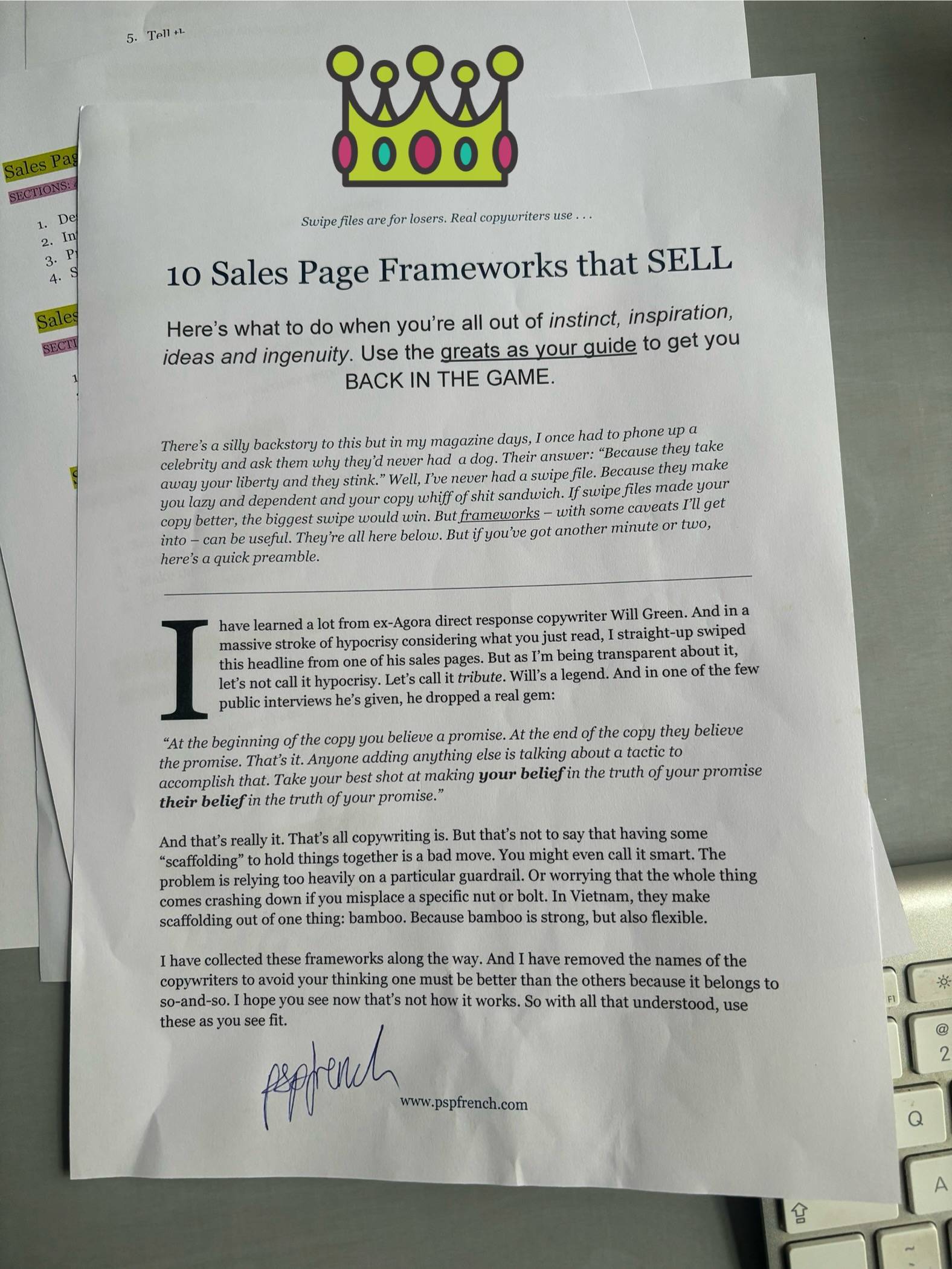 I once had to phone up a celebrity and ask them why they’d never had a dog. Their answer: “Because they take away your liberty and they stink.” Well, I’ve never had a swipe file. Because they make you lazy and your copy sloppy. But frameworks? They rock.